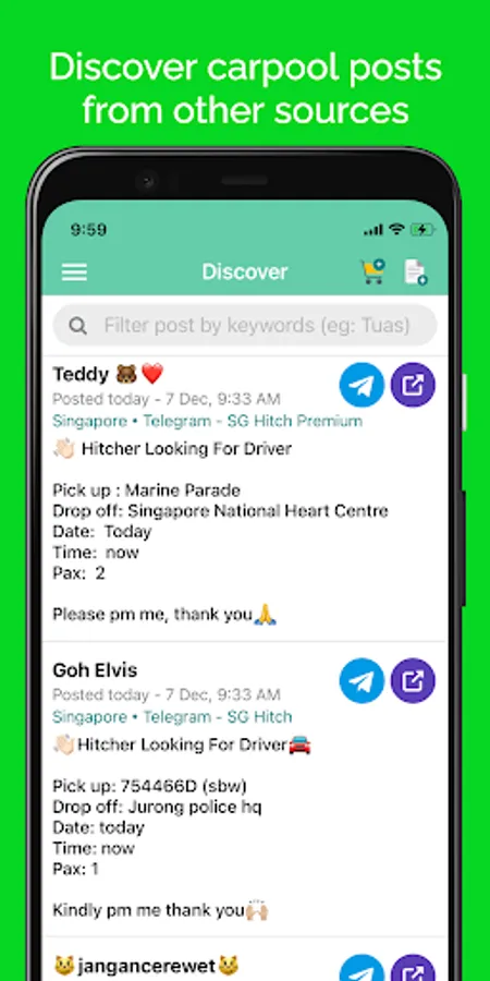 Discover Carpool Easily: Now it is easier than ever to search for your carpool partners. Other than search for the carpool offer/request posted in WeRide, now you can also search for carpool posts from other sources in our app.