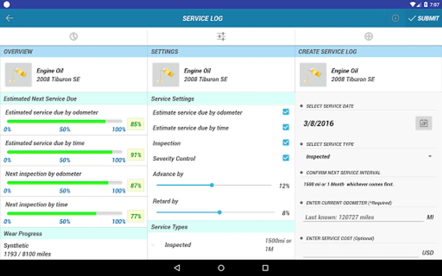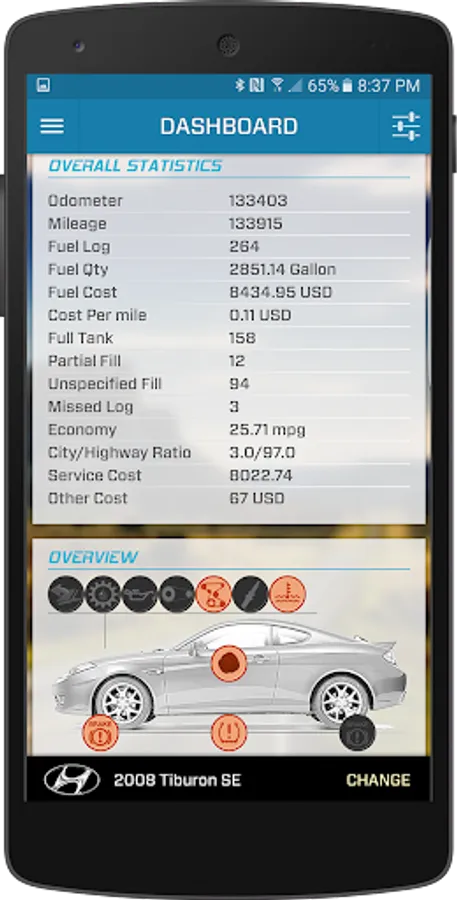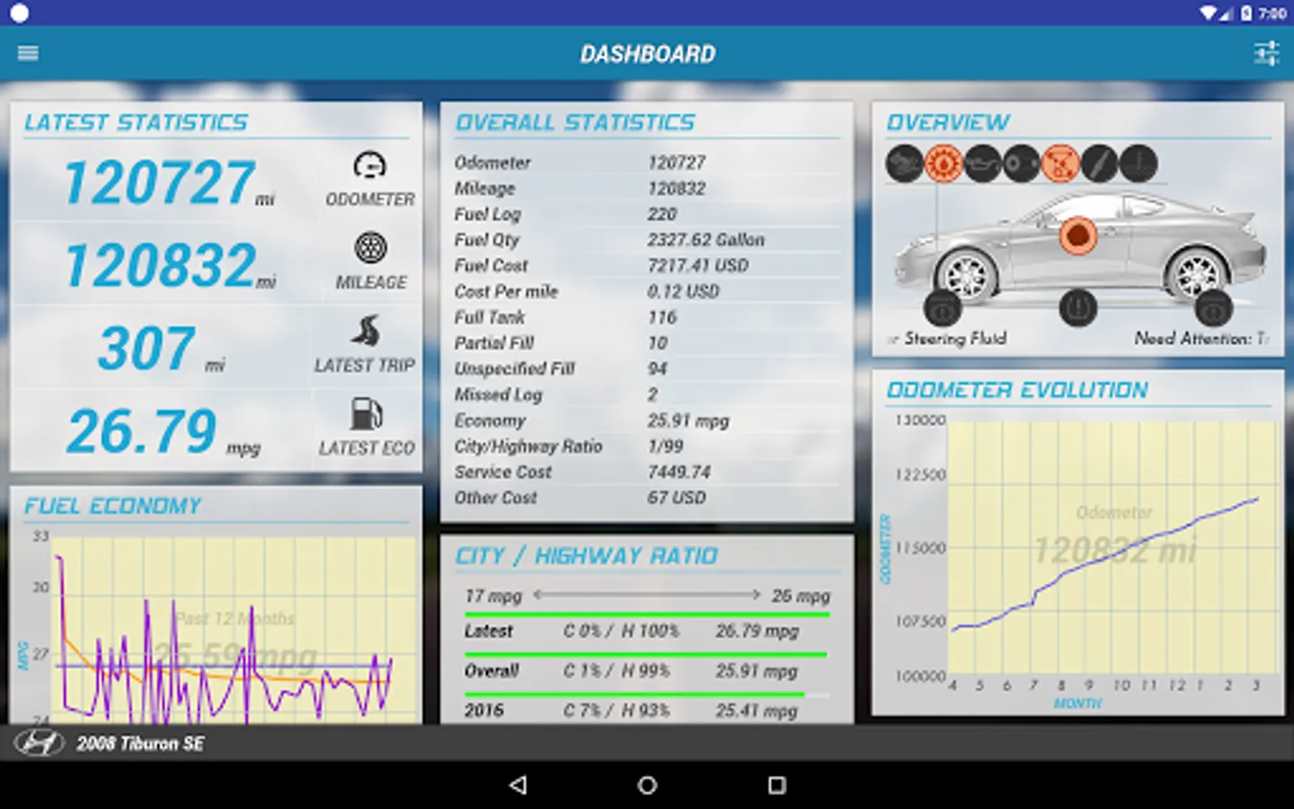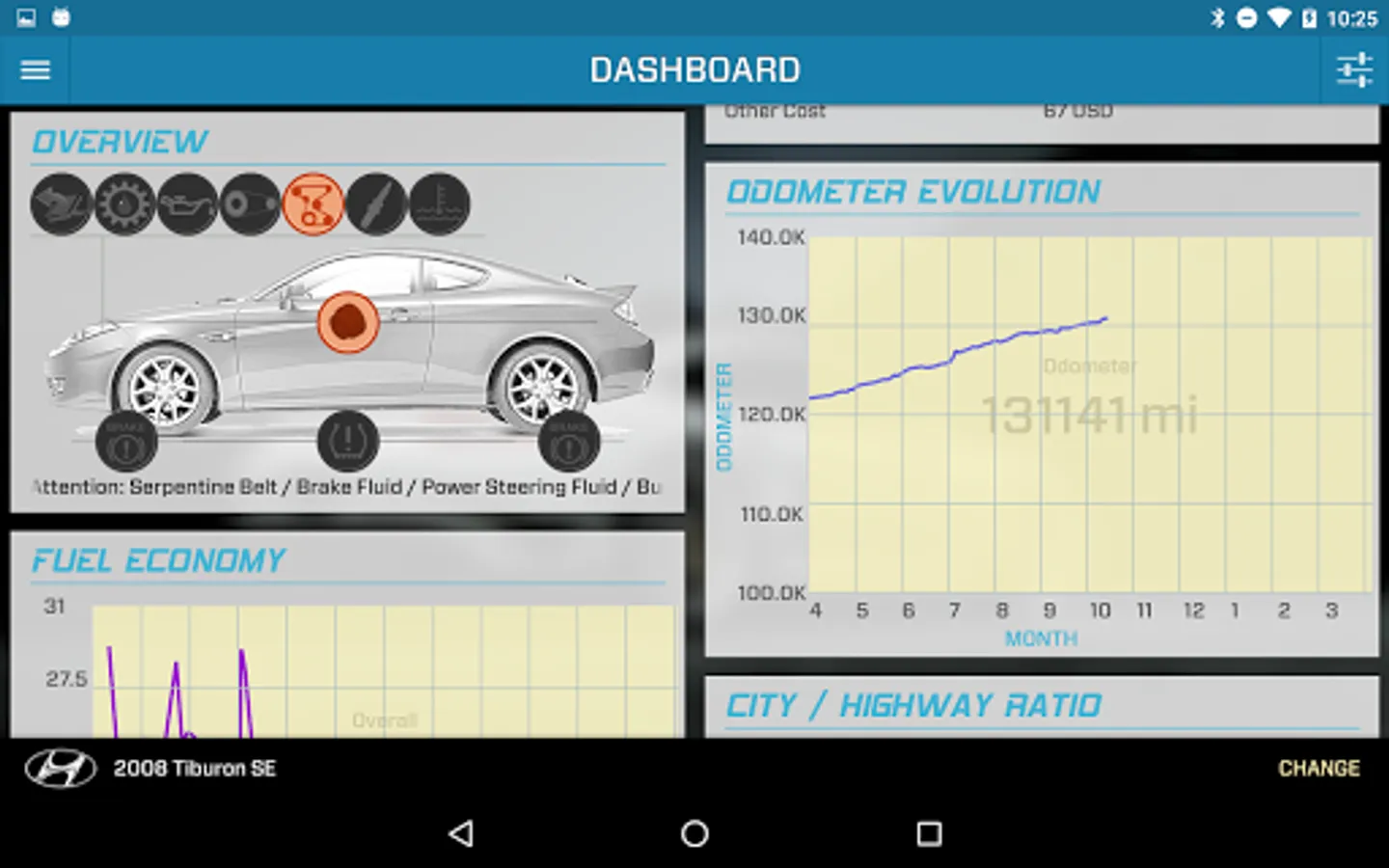 Many people neglect the importance of maintaining oils, chemicals, and many parts that need to be replaced to prolong the car's life span. This app helps car owners, especially newbies to cars, manage their cars, track mileage, track what services need to be done, and so much more. The users can visualize their car parts' estimated life span so they can prepare upcoming maintenance. Log re-fuel information to keep track of your vehicle's fuel economy. Tired of manual logging? You can also use an OBD adapter to log real time data.
