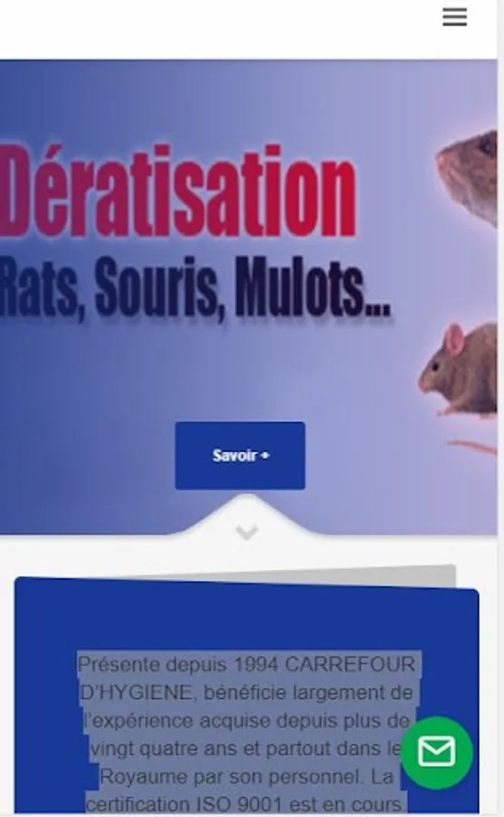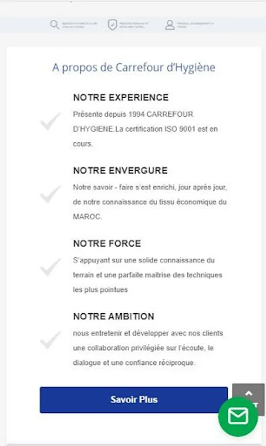 Present since 1994 CARREFOUR D’HYGIENE, benefits greatly from the experience acquired for over twenty four years and throughout the Kingdom by its staff. ISO 9001 certification is in progress.