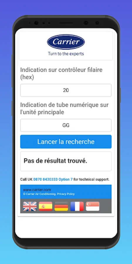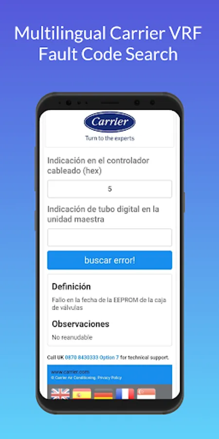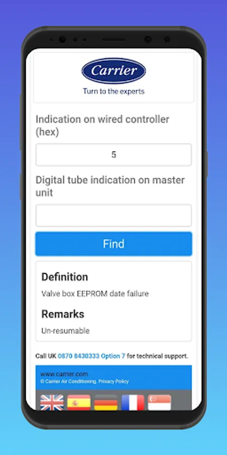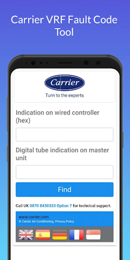 This simple to use App allows you to enter the fault code displayed by your Carrier Air Conditioning unit to assist in diagnosing issues and provide troubleshooting help.