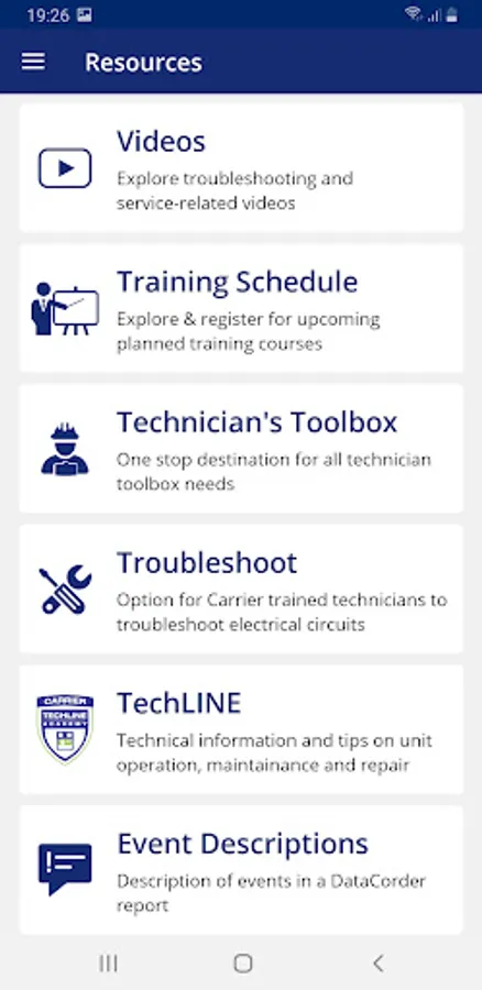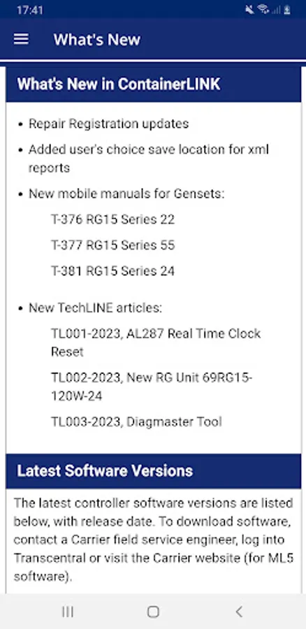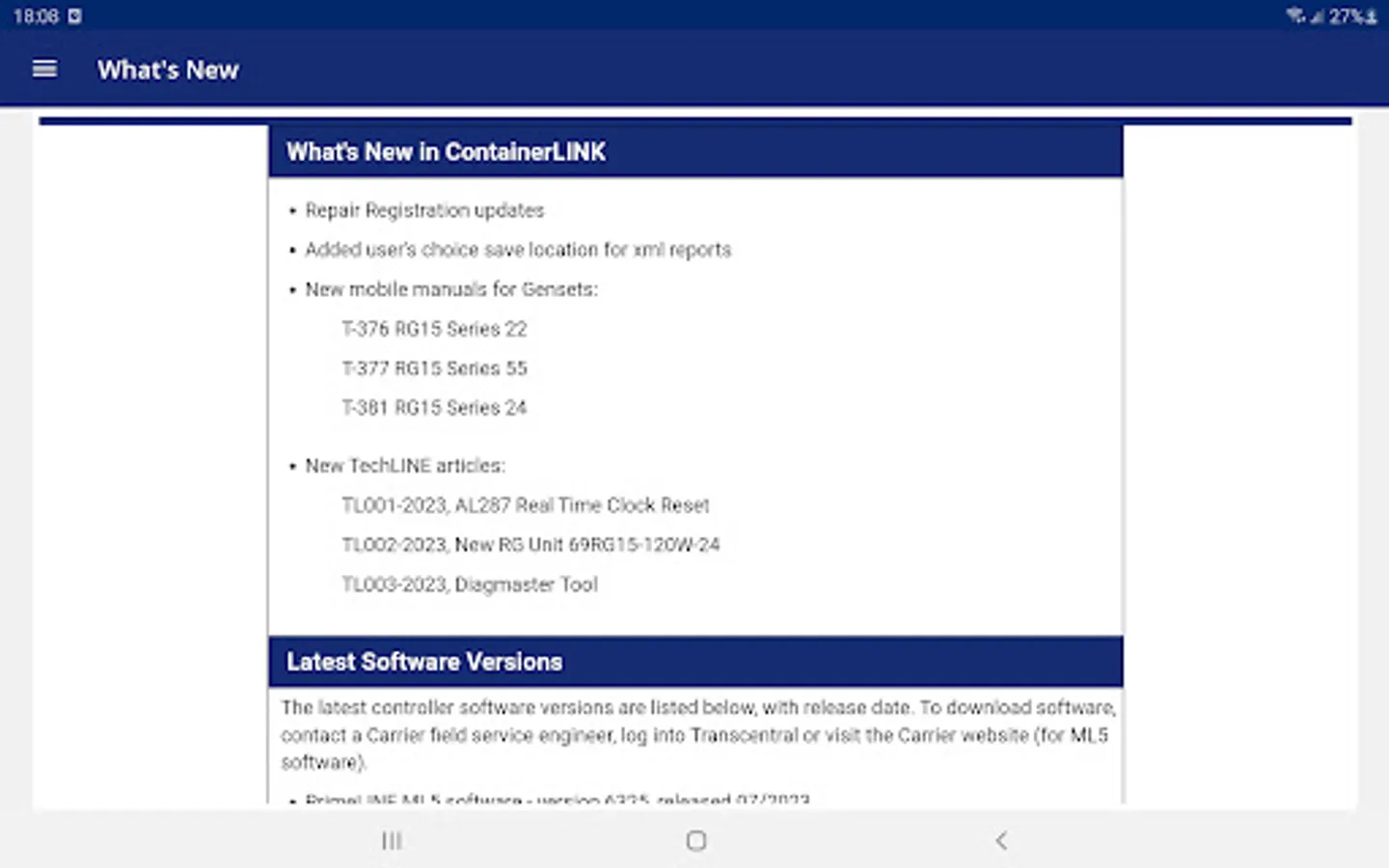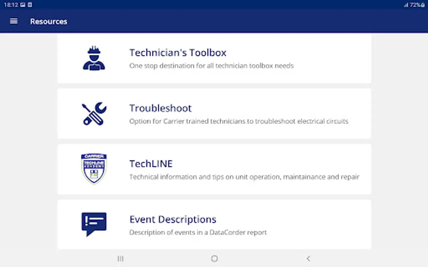 The Carrier Transicold ContainerLINK™ service app offers interactive resources for customers and service technicians, including:
