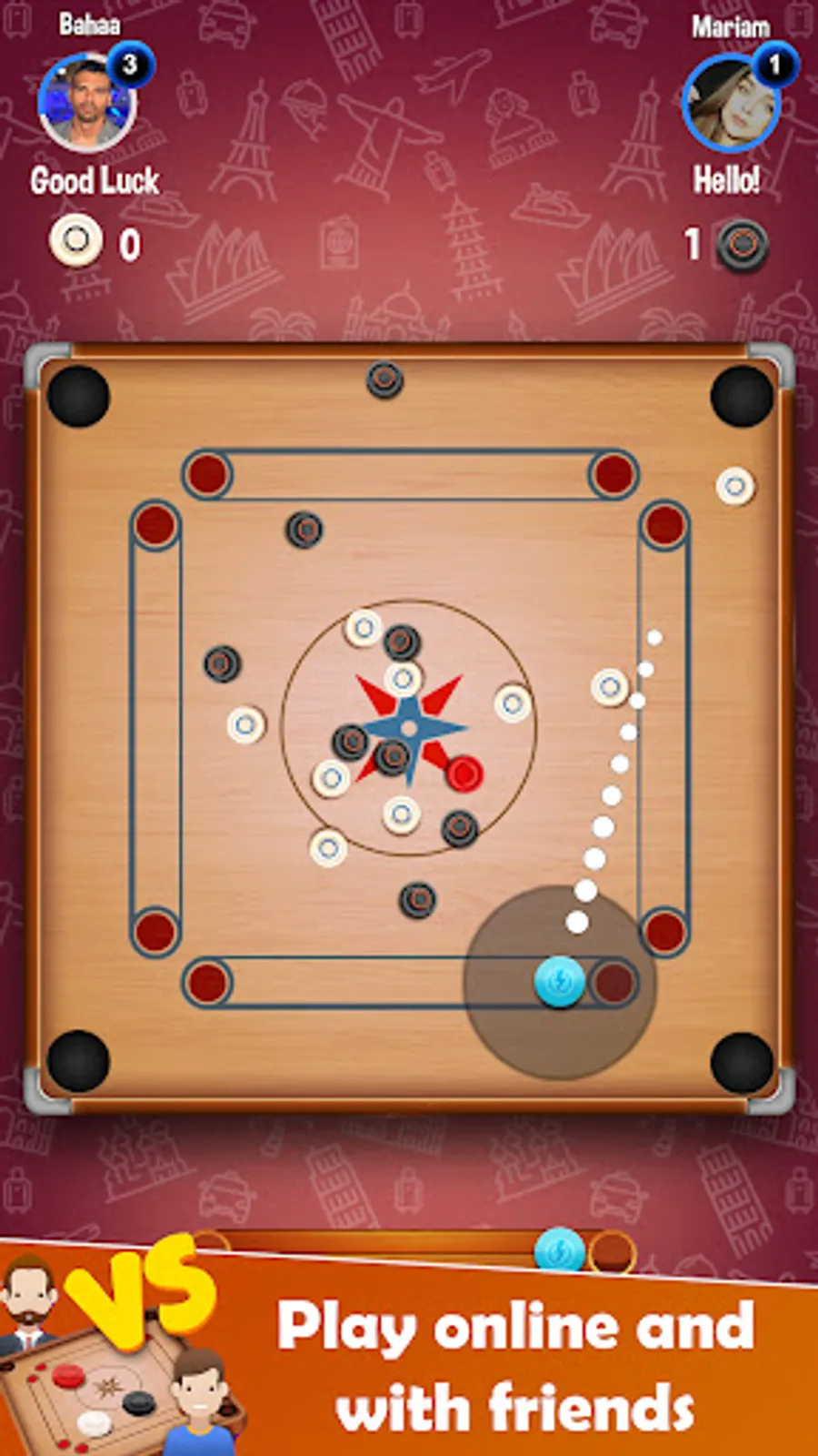 - Play with best random carrom board players from around the world in multiplayer mode