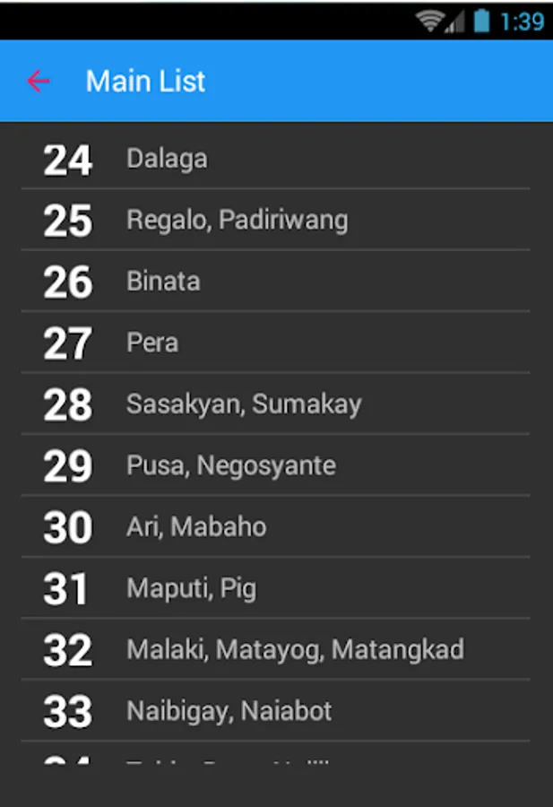 Jueteng numbers meaning in English, Tagalog and Ilocano.