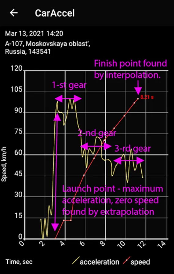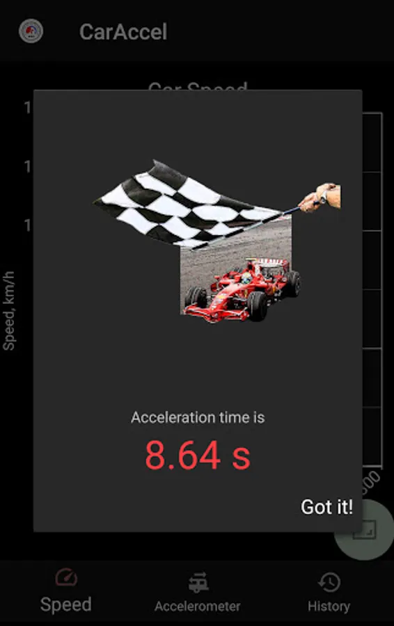 Measure your vehicle acceleration time up to 100 km/h (0-60 mph) with this cool speed vehicle meter and compare it to documents.