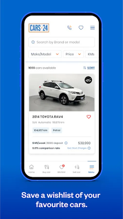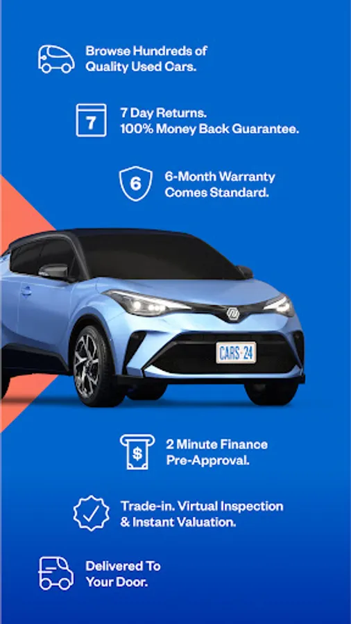 The CARS24 Android app is a revolutionary way to easily buy, sell, and trade-in top quality used cars 100% online. Browse 1200+ cars with the biggest range of makes and models all with competitive finance rates, extended warranties and the fastest delivery times in town - You are guaranteed to get the best deal all from the palm of your hand.