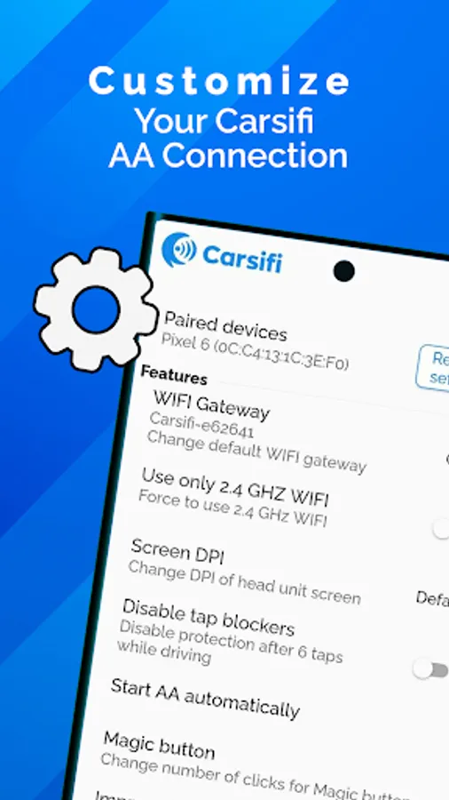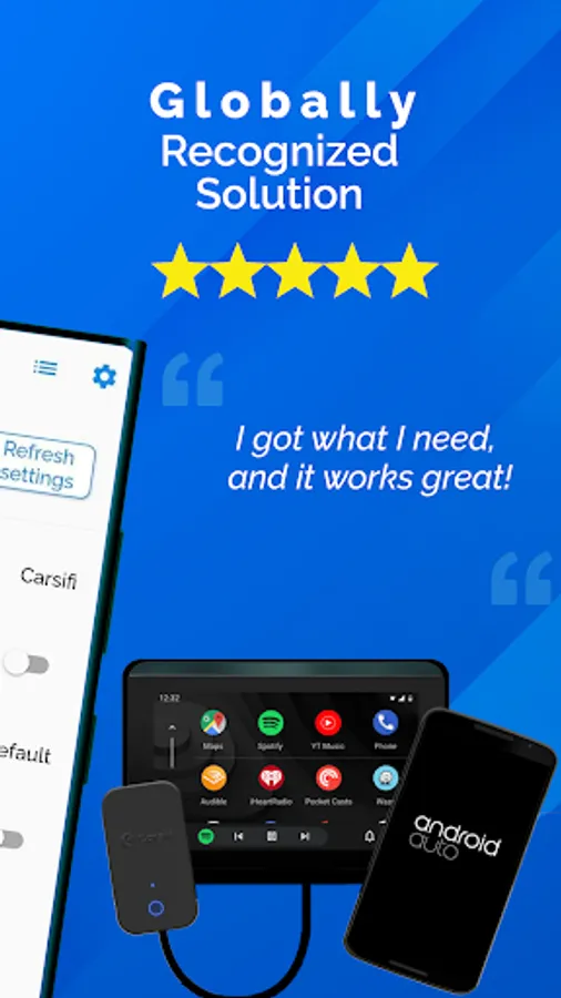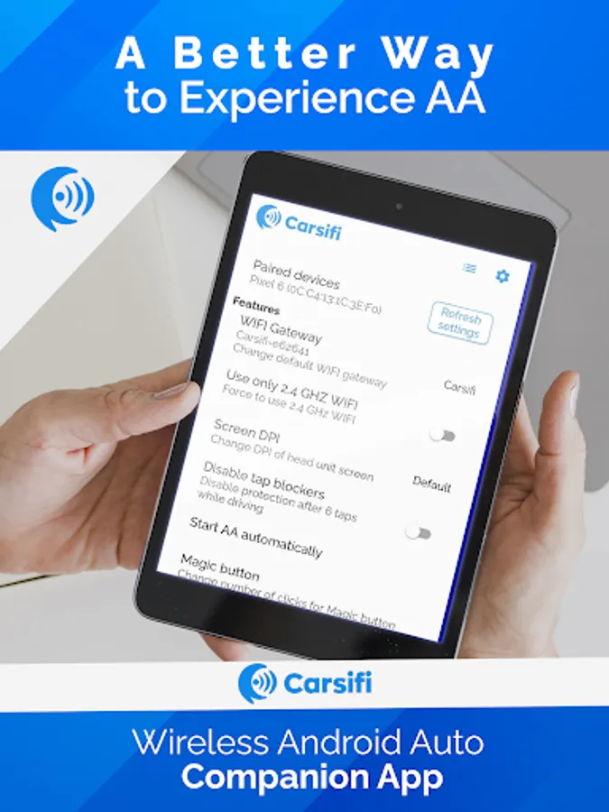 Carsifi Wireless Android Auto is a companion app for the Carsifi wireless android auto adapter which eliminates the need to connect your phone to the Android Auto USB port with a cable. Instead, your car detects Carsifi adapter as an Android device and starts transferring data which Carsifi reroutes to your Android device via Wi-Fi.