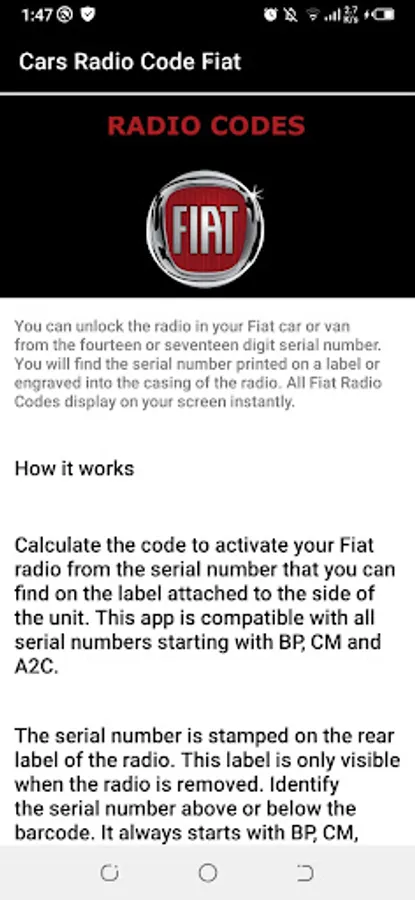 You can unlock the radio in your Fiat car or van from the fourteen or seventeen digit serial number. You will find the serial number printed on a label or engraved into the casing of the radio. All Fiat Radio Codes display on your screen instantly.