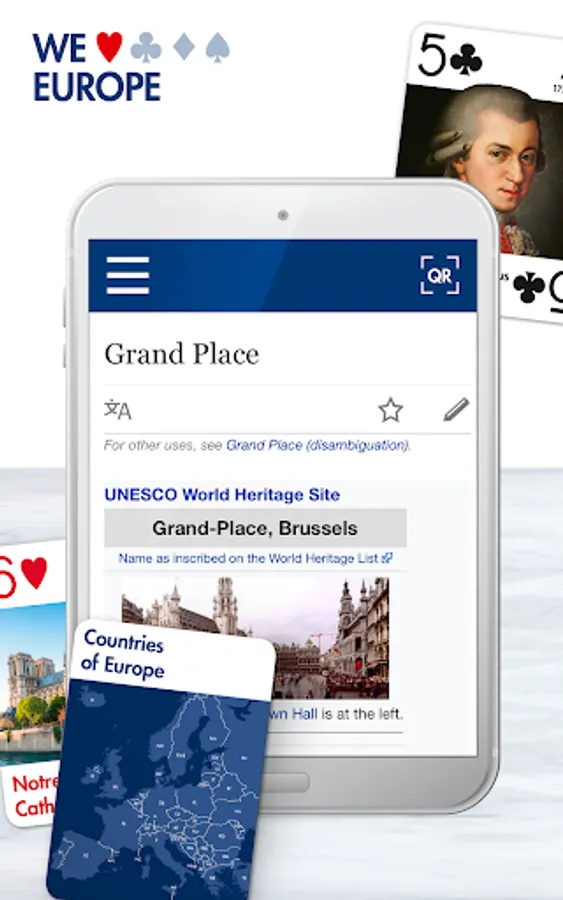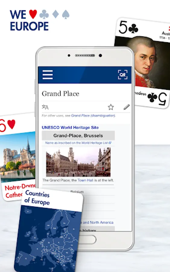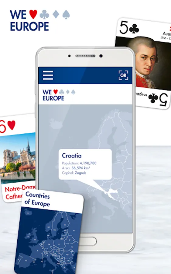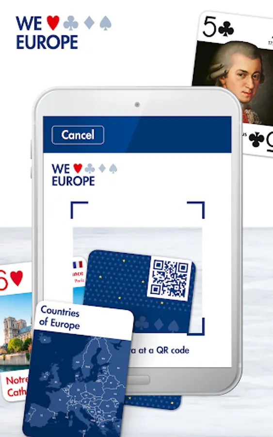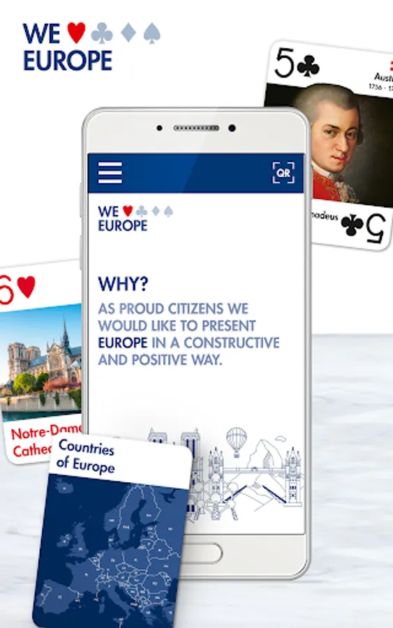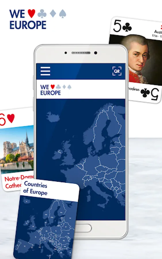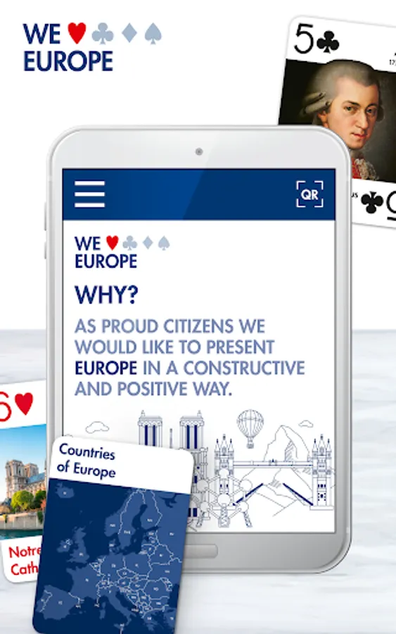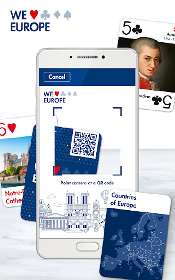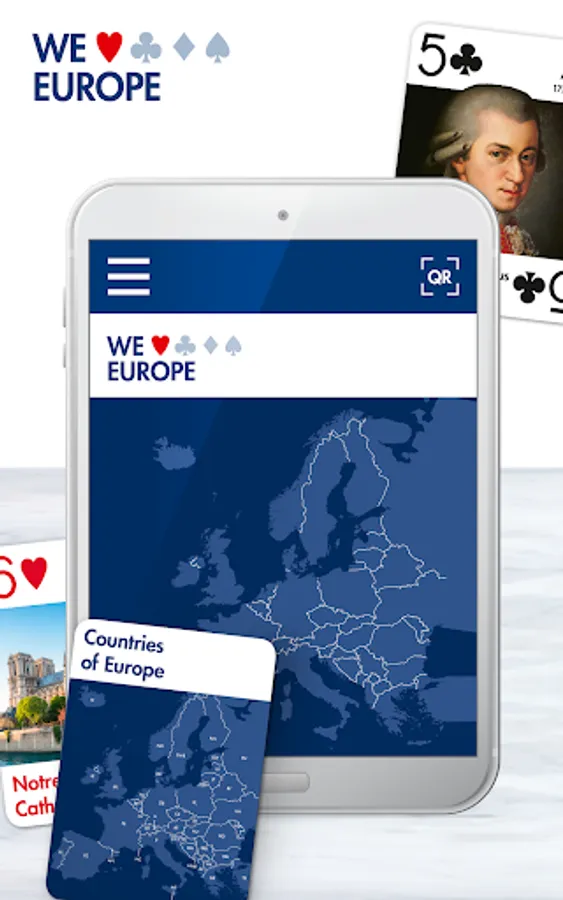For the 60th anniversary of the Treaty of Rome, world’s leading card and board games manufacturer Cartamundi, made a special set of two decks of cards. The first deck visualises the UNESCO monuments, the second deck honours the artists, scientists, emperors and composers who contributed their skills to the European Union. With the Europa Deck app you will be able to learn more about Europe and its treasures. By scanning the QR codes on the backs of the cards you will get additional information about the subject on that card.