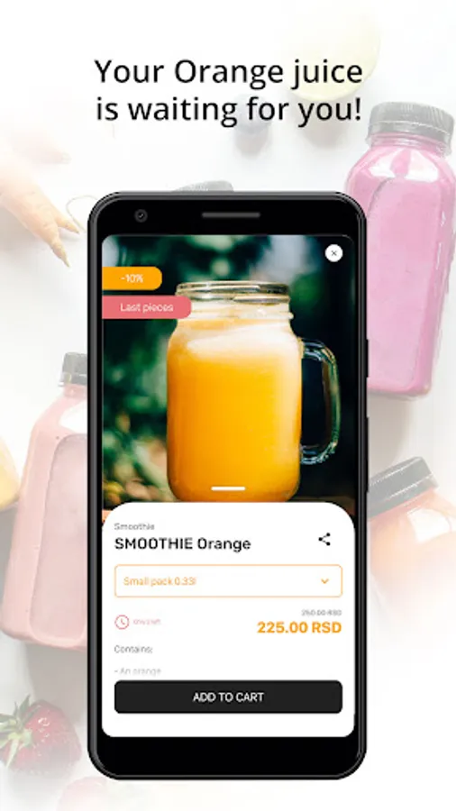 In addition to the fact that you can order our products with one click via the mobile application, you can always come to our little kingdom of fruits and vegetables and we will mix a drink from the ingredients you choose on the spot!