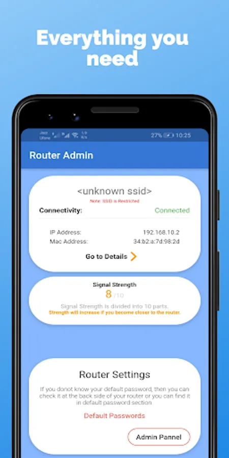 In this Router Admin app, you will get every Wi-Fi details like IP address, Mac address, SSID, BSSID, Frequency, Signal Strength, and many more.