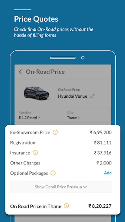 • On road car price - Get accurate and up to date ex-showroom, on road price and price breakups for all cars sold in India of brands such as Maruti Suzuki, Ford, Honda, Hyundai, Renault, Tata, Toyota, Mahindra, Nissan, Datsun, Audi, Mercedes-Benz, BMW and so on.