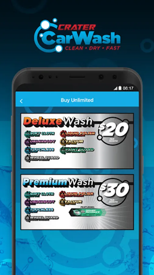 Use our Mobile App to Manage Unlimited Monthly Plans, Purchase Washbooks, and even send washes as gifts!