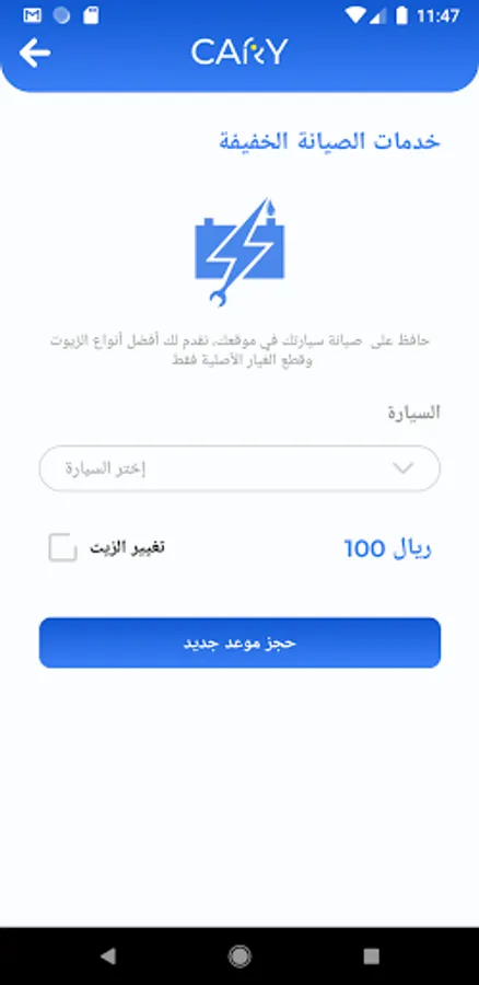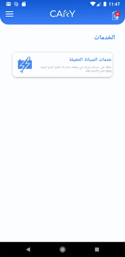 منصة كاري لتقديم خدمات صيانة السيارات الخفيفة مثل غيار الزيت وغسيل السيارات وغيرها من الخدمات القادمة بالمستقبل، حيث نوفر قطع الغيار الأصلية والمواد ذات الجودة العالية فقط باحترافية ومرونة عالية، حيث يتم تقديم الخدمات في موقع الذي يختاره العميل عبر مركبات مجهزة بأعلى المعايير لصمان تقديم أفضل الخدمات.