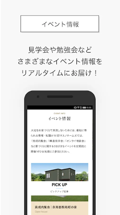 This app was developed to deliver new information and useful information to customers who are starting to build a house and customers who have built a house at Masuno Homes.
