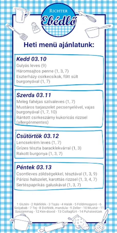 Operational canteen at the Dorog branch of Gedeon Richter Plc. The canteen is open to all Dorog workers and those working in the Dorog factory. Opening hours: Monday to Friday, 11:30 to 15:00.