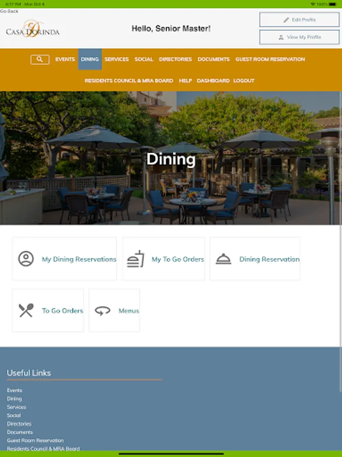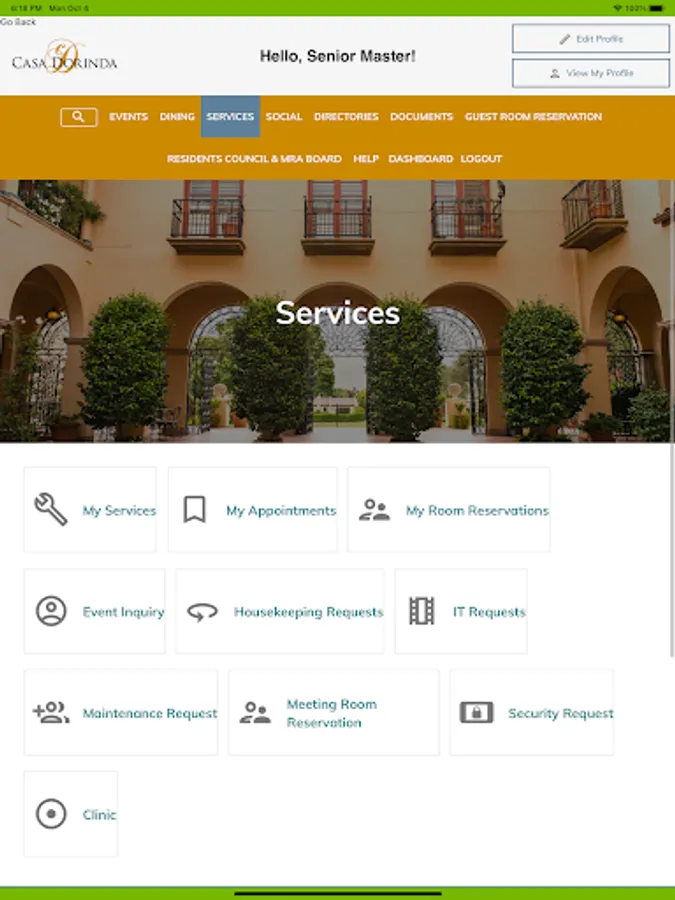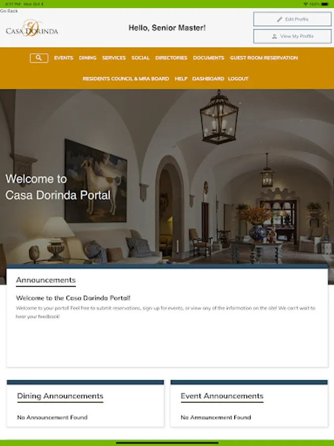 The Casa Dorinda resident communication center mobile application has user functionality to register for events, digitally submit forms, view community documents, view resident and staff directories, and engage with other residents of your community.