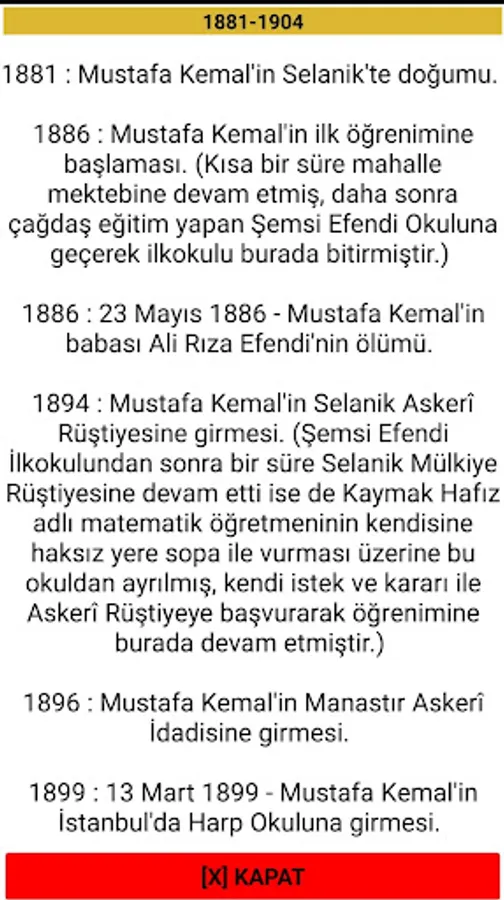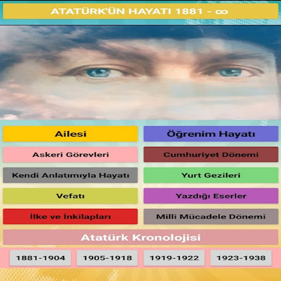 Information such as Atatürk's family, his childhood, the schools he attended, his military life...