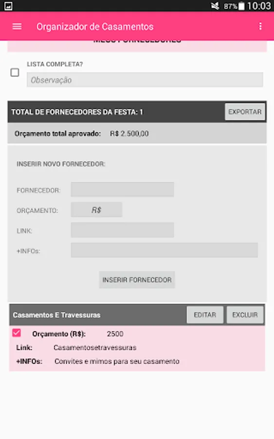 With an intuitive and user-friendly menu, control the progress of the wedding preparations. Save the most important dates and do not let anything pass, the church details of the party details! Compare suppliers and organize the guest list. .