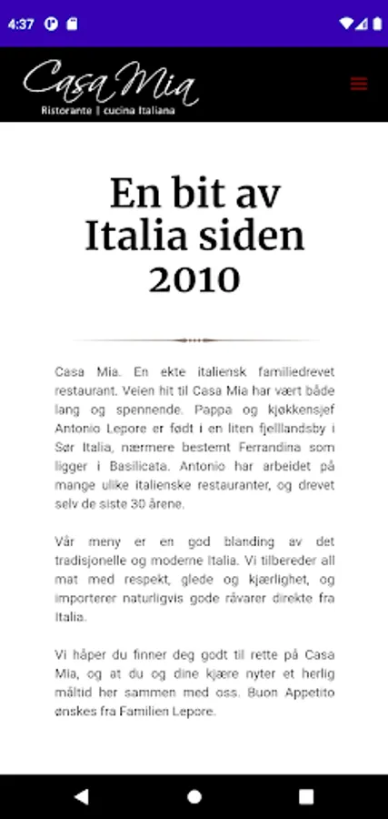 Casa Mia. A real Italian family run restaurant. The road to Casa Mia has been both long and exciting. Dad and head chef Antonio Lepore was born in a small mountain village in southern Italy, more precisely Ferrandina, located in Basilicata. Antonio has worked at many different Italian restaurants, and has run them himself for the past 30 years.