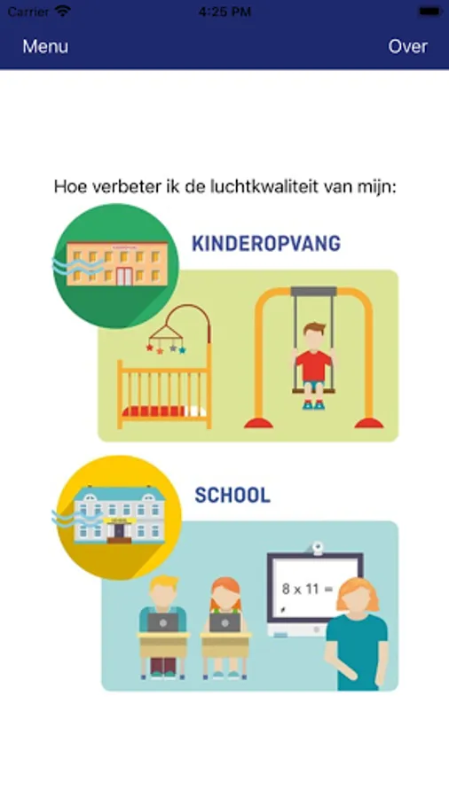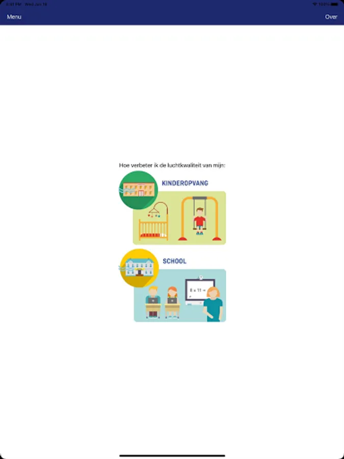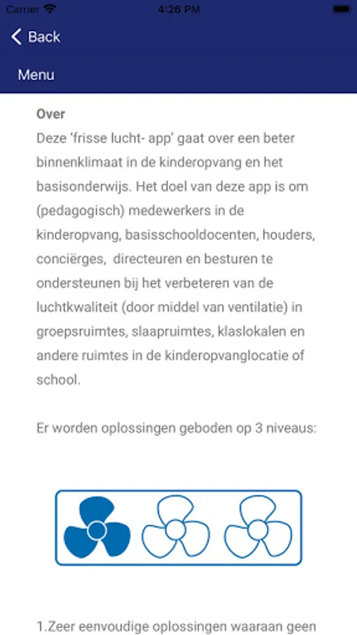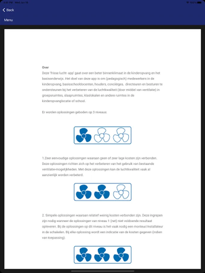The air quality in childcare and school is often insufficient. With this app, employees in childcare and at school can quickly ensure cleaner air in their room or locally via a step-by-step plan. Building administrators such as site managers and janitors can use the app as a source of information in a larger approach to improving ventilation in schools or childcare facilities. The texts in this app are written in simple language. So that even users who have no knowledge of the subject can easily use the app.