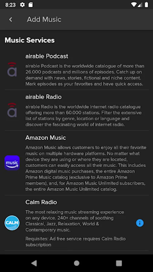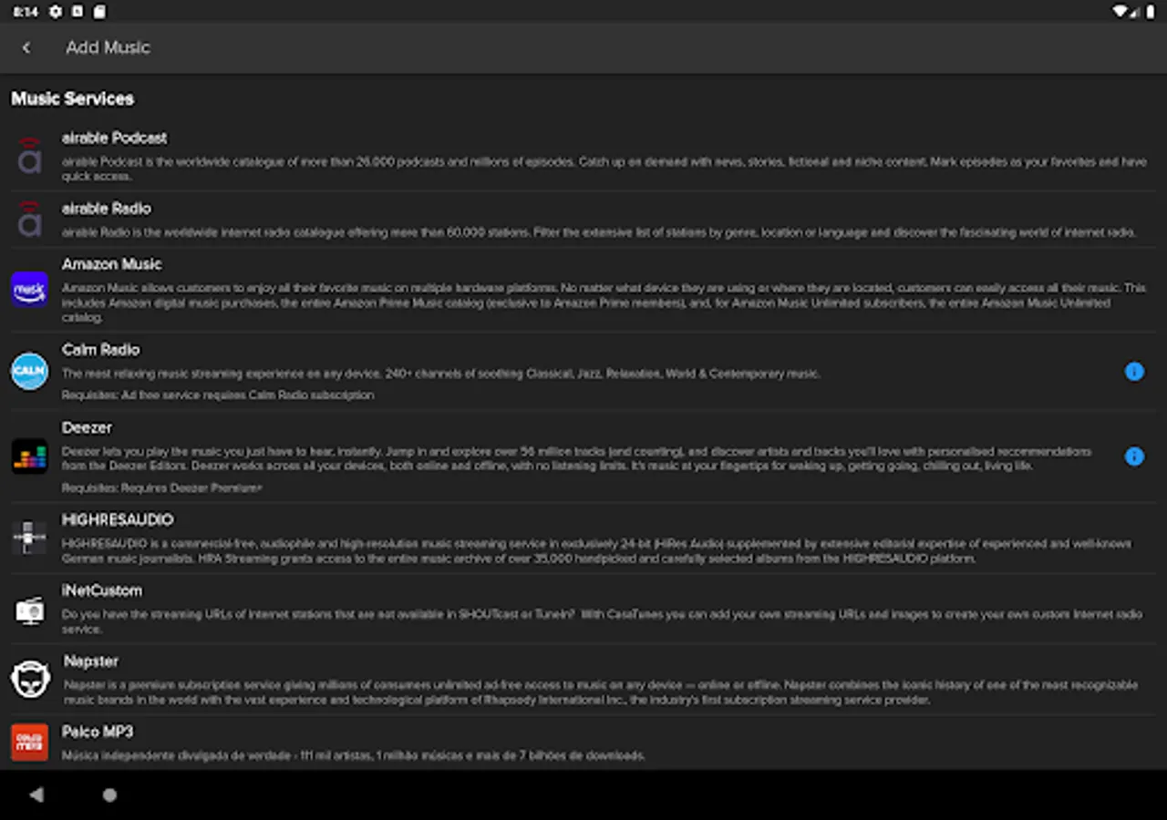With access to unlimited music, available from popular music services, such as Spotify, Amazon Music, Deezer, Qobuz, Napster, SoundMachine and Tidal, as well as access to over 100,000 free Internet radio stations from around the world using our popular Airable Radio & Podcasts, Calm Radio, Shoutcast, and TuneIn radio services, CasaTunes puts you in control of your music experience.