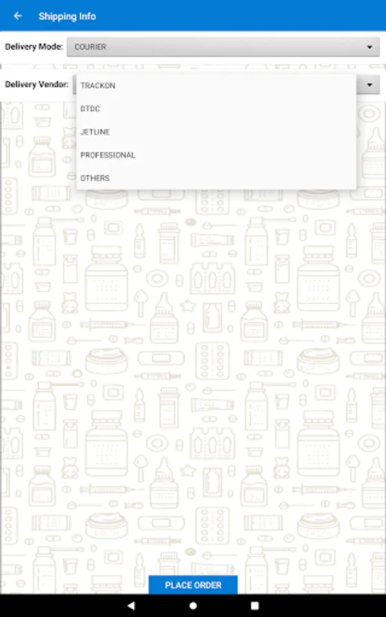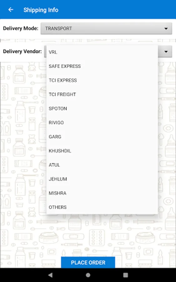 3. Users can place their order/ product requirement through our app with an option to choose the shipping mode and vendor. In addition to this, users can also view their current active orders which have not been billed yet.