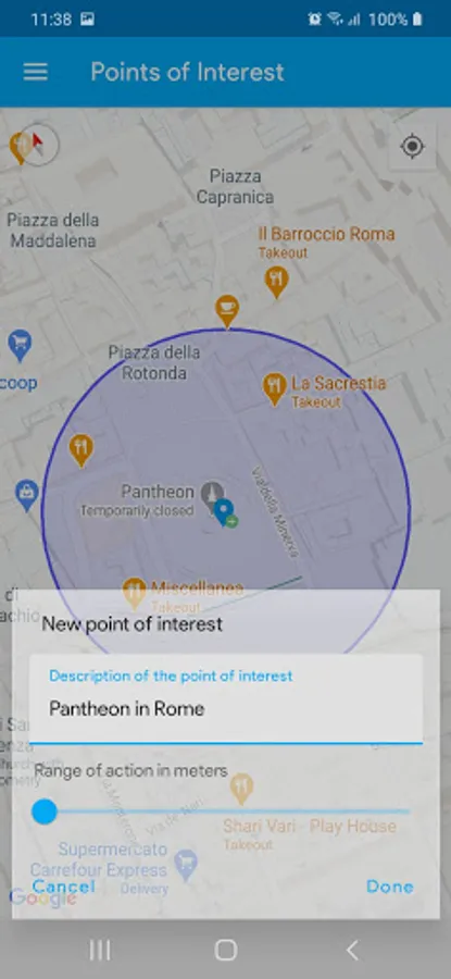 It is simple to workout, just set the icon in the center of the screen on the location in which you are interested, click on the icon, put a brief description and the action range in meters of the alarm that will be triggered.