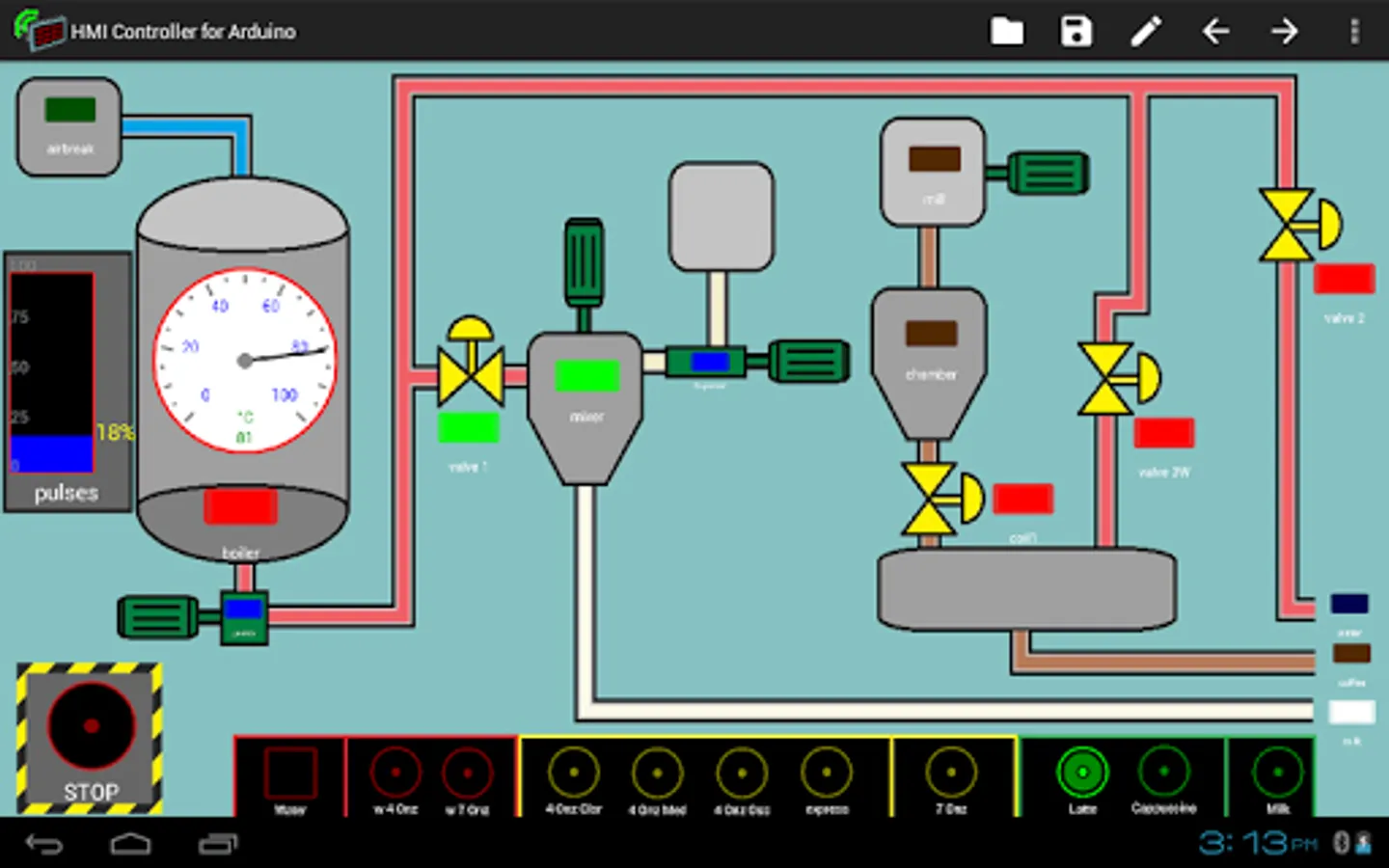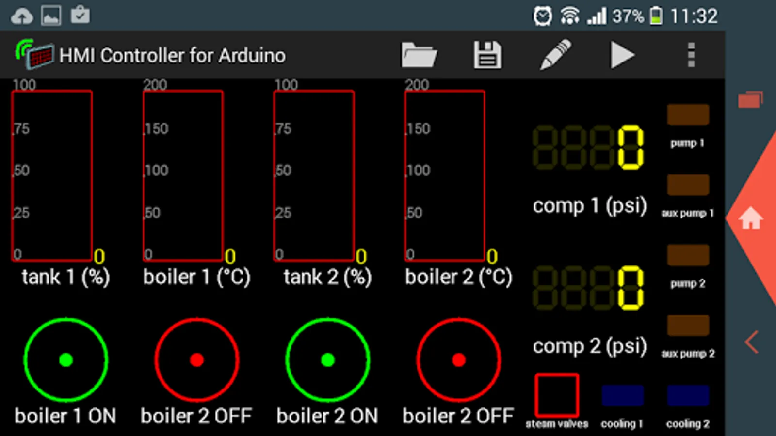 Make your own customizable hmi in the app without the need of a computer, you can select from seven different objects (widgets): button, switch, led, display 7 segments, numeric display, bar indicator, slider and graph.