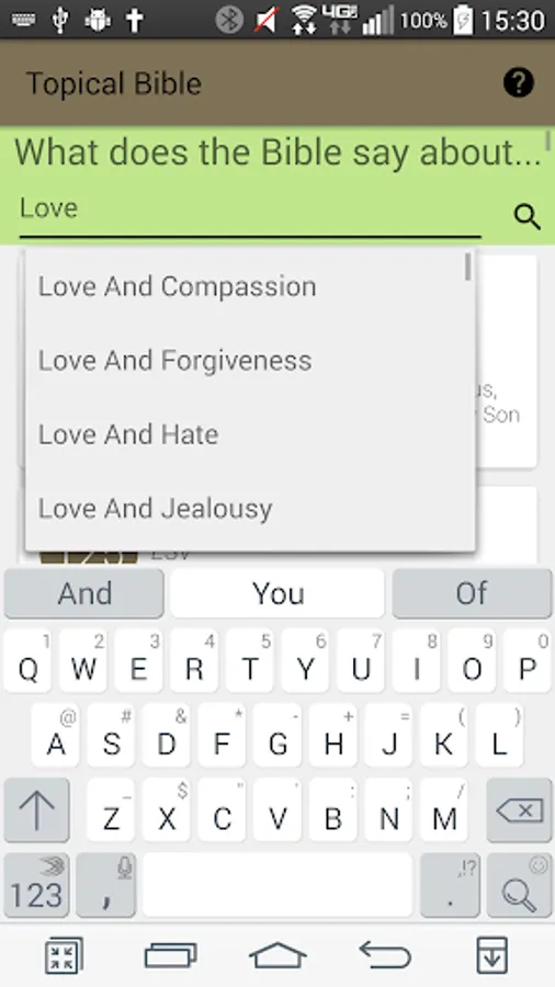To use, simply enter a word or phrase and hit the search icon. The app will download the results from OpenBible.info and display them in the list below. The downloads suggestions in the background and displays them as you type.