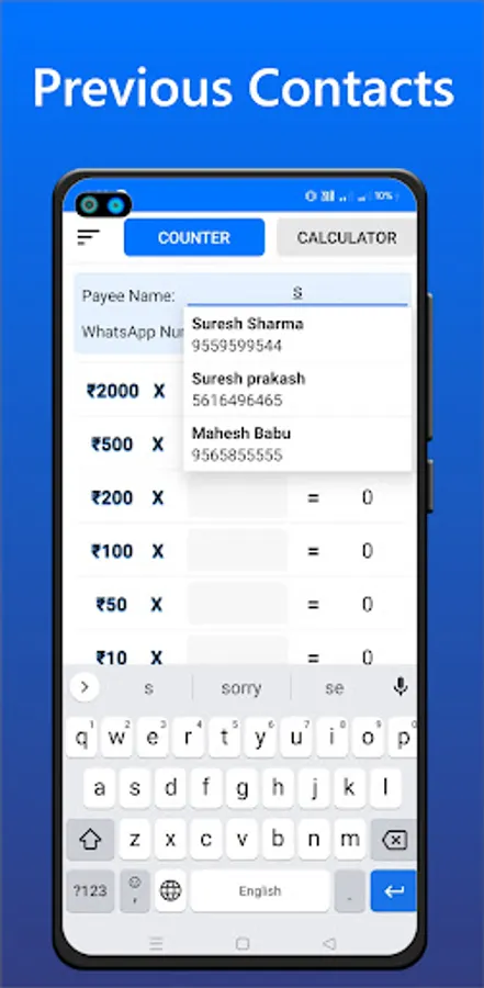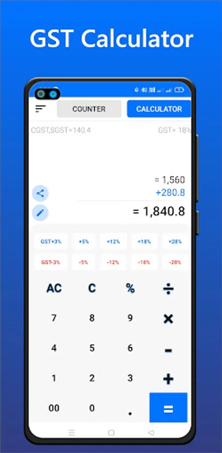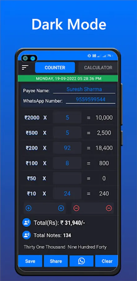Calculates complex calculations and displays the total count and value of currency notes on your screen, thereby eliminating any waiting time and increasing productivity, and also calculate GST.