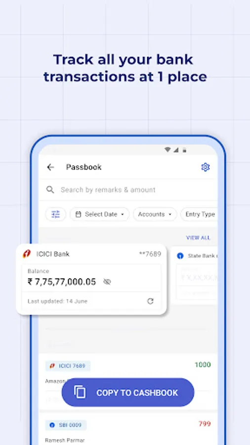 Your data and entries get backed up automatically. You can access all your CashBook entries from different devices by logging in with your registered mobile number.