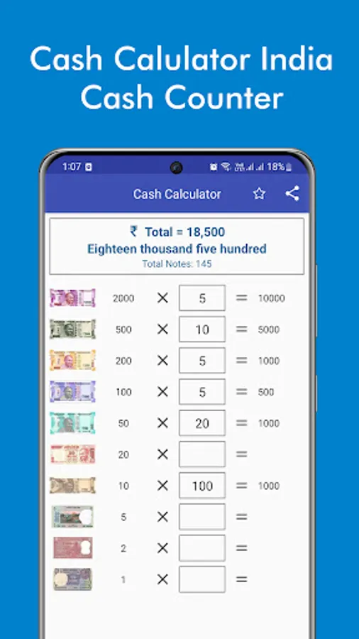 Cash Calculator India - Cash counter lets you calculate total amount of money in forms of currency notes easily. Tally your cash amount with this app.