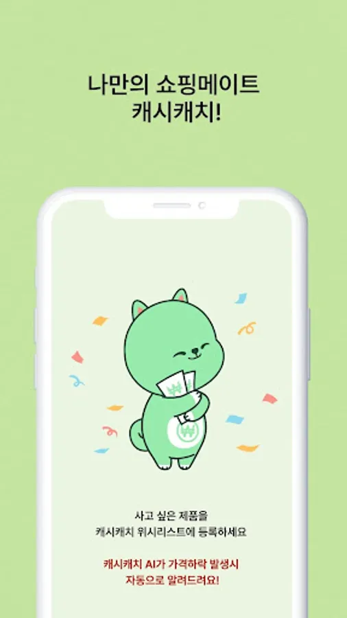 우리의 귀여운 마스코트 캐치는 당신의 쇼핑목록에서 오히려 돈을 돌려받을 수 있게 도와줄거에요. 캐치는 여러분의 쇼핑 목록을 대신 들고다니며 가격 할인이 발생하면 바로 알려줄거에요.