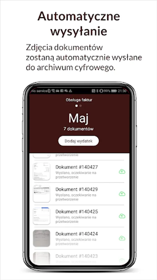 The Invoice-Invoice application allows you to take pictures of invoices and other company documents that will be automatically sent to the Expenses module on the portal.obslugafaktur.pl website (digital archive).