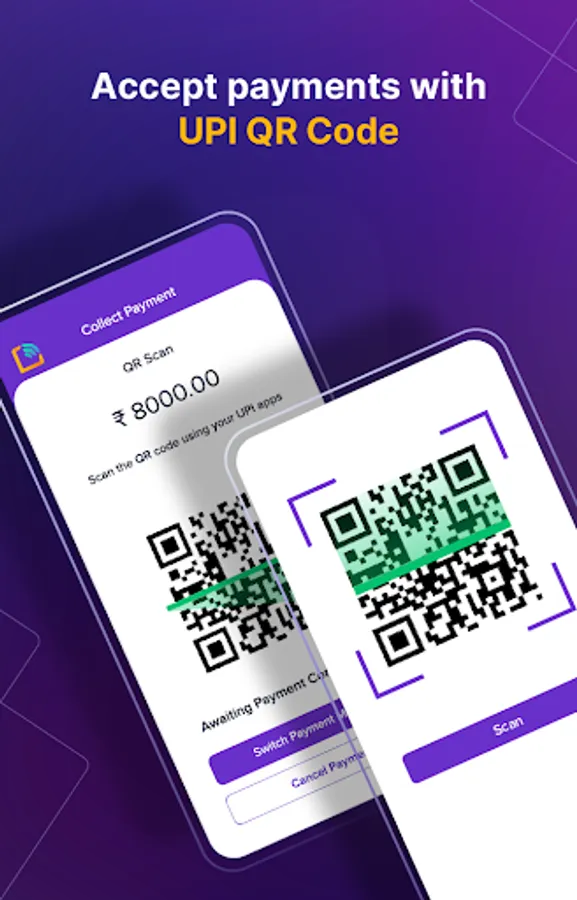 - Generate UPI QR code on the phone, customer can scan via any UPI app & pay