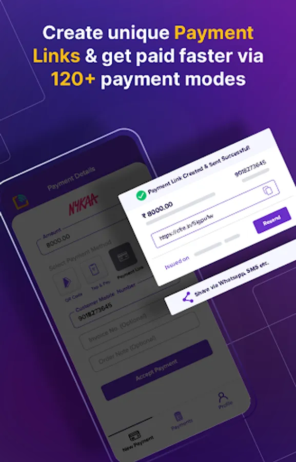 Use the app to generate UPI QR codes on the phone, or let customers Tap & Pay using a card. You can also generate Payment links, that can be shared over Whatsapp or SMS, and get paid instantly.