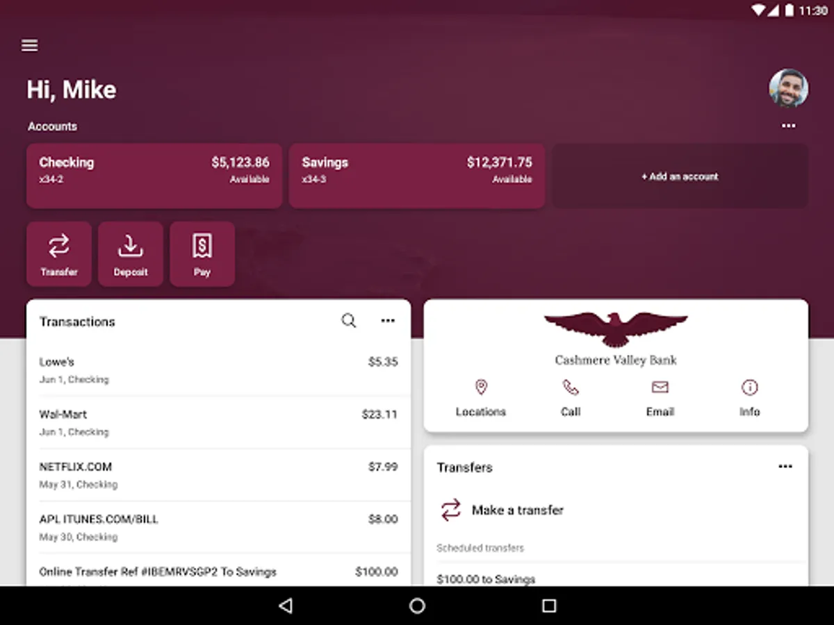 Contact: Locate ATMs or branches and contact Cashmere Valley Bank customer service directly from the app.