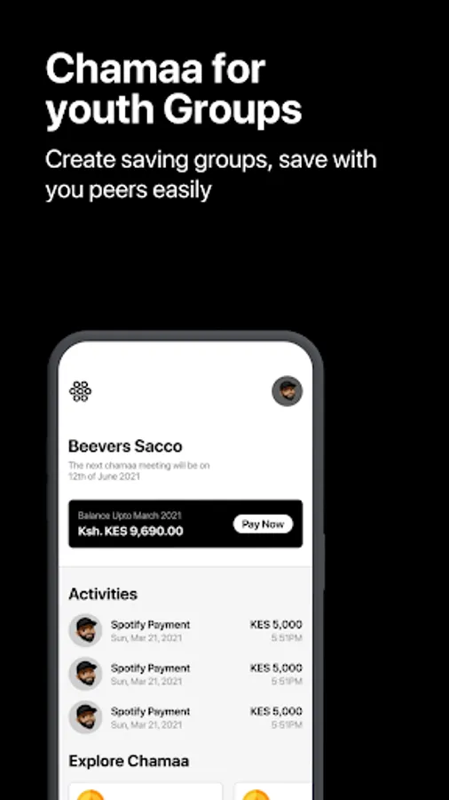 Our main feature is the Savings and saccos part which has various easy to use features to to help attain our objective. We call it Cashon Chamaa