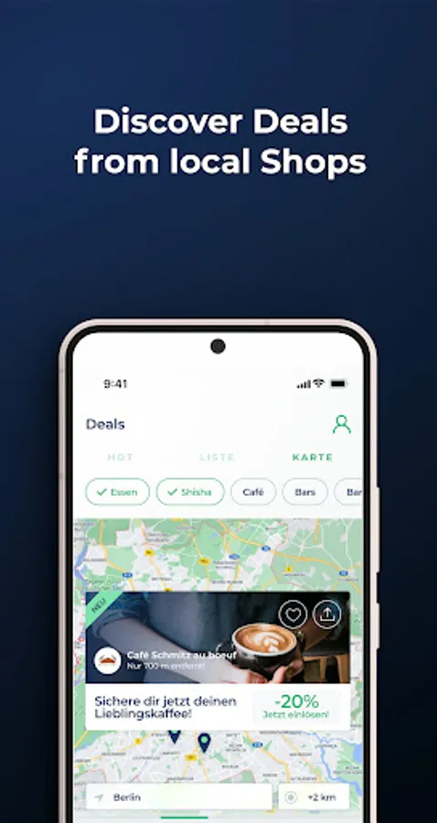 Search the map to find stores near you where you are currently redeeming a deal. Secure unique offers at local restaurants, bars, bakers, cafés, hairdressers, beauty salons and many more. Redeem the deal directly when you visit the store and benefit from discounts or free goodies. With the Cashtag app you are guaranteed to find the best deal in your area.