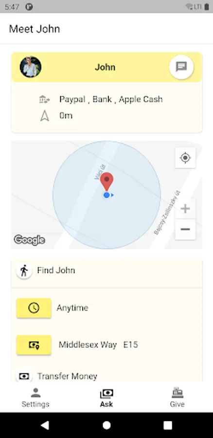 Do you need cash? Is the nearest ATM too far? Try Cashtic! Ask nearby users for cash, and once you meet and get it transfer the equivalent amount via your own money transfer app. You can specify in the app how you will settle the cash you receive, eg: bank, Paypal, Zelle, Revolut, Bitcoin, Google Pay, PayTM, Wise, or Apple Pay. Please note Cashtic does not transfer money at the moment. Arrange meetings in front of police or guarded areas for increased safety.