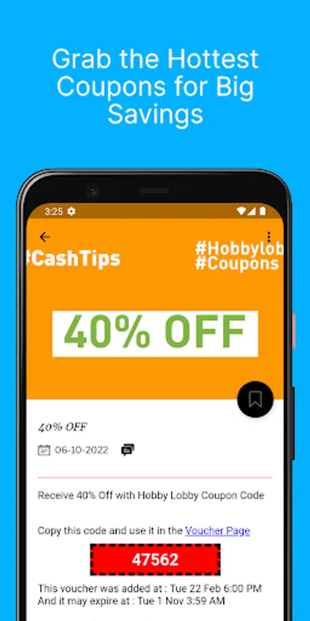 🎨 Exclusive Coupons & Promo Codes: Access a treasure trove of coupon codes and promotional offers that will instantly slash prices on your favorite Hobby Lobby items. Whether you're looking for seasonal decorations or crafting essentials, our app ensures you never miss a chance to save big.