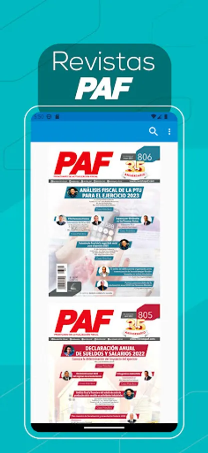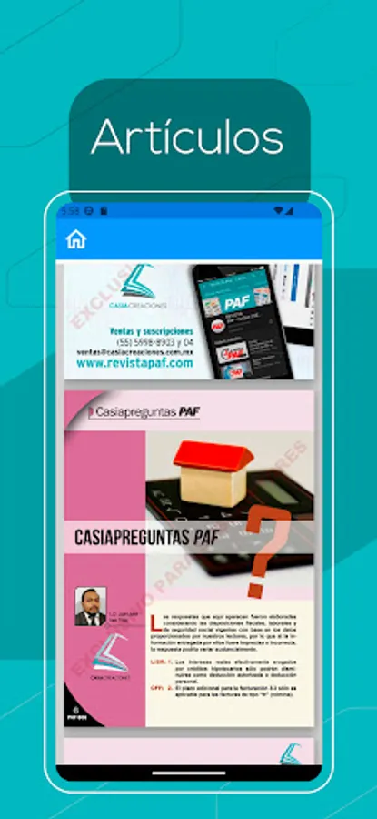 Access the best content on tax matters with Casia Creations. Our application offers you access to the PAF magazine. With an elegant and functional interface, Casia Creaciones transforms your device into a personalized virtual library where you can consult articles and our catalog of magazines.