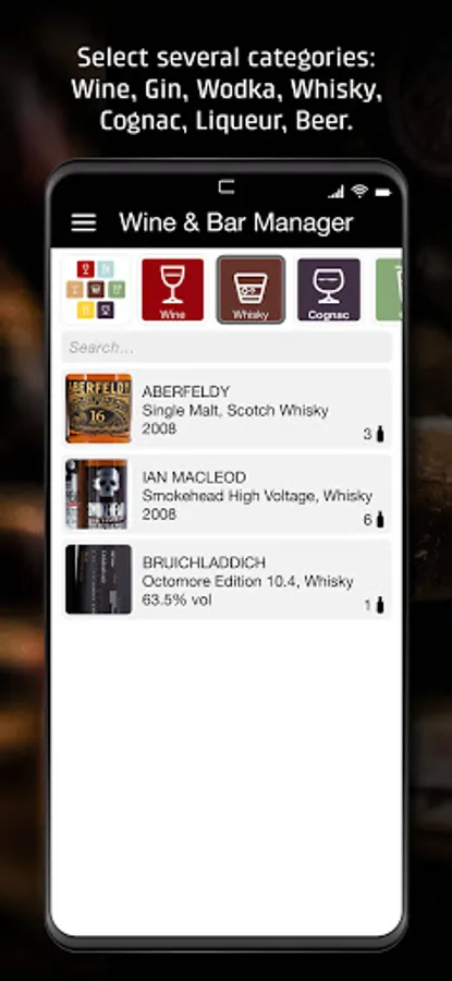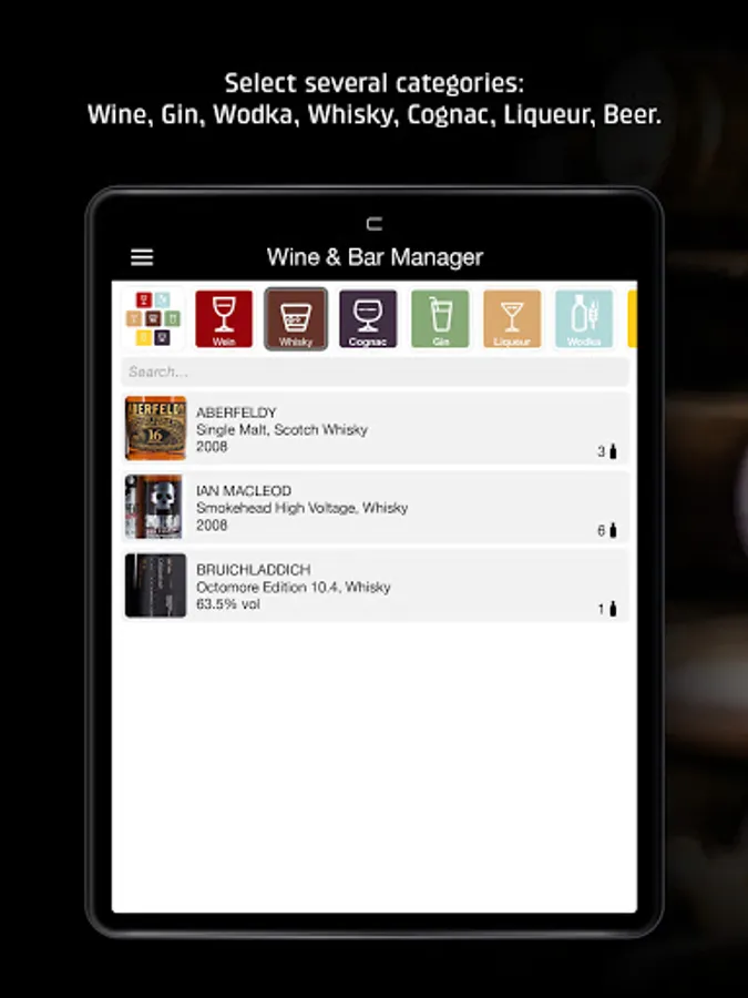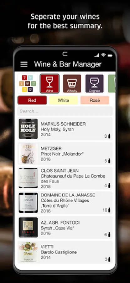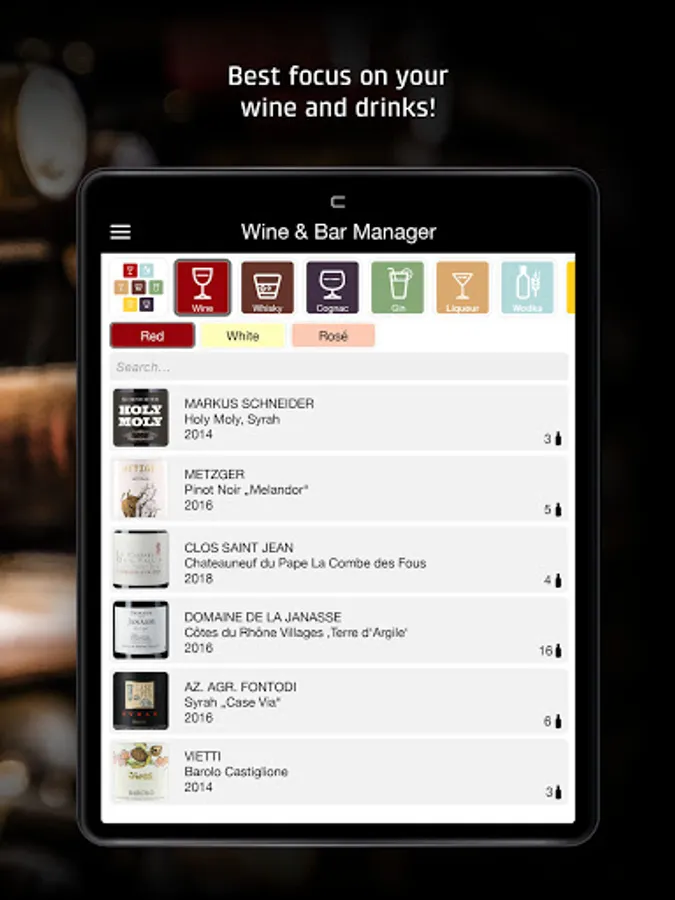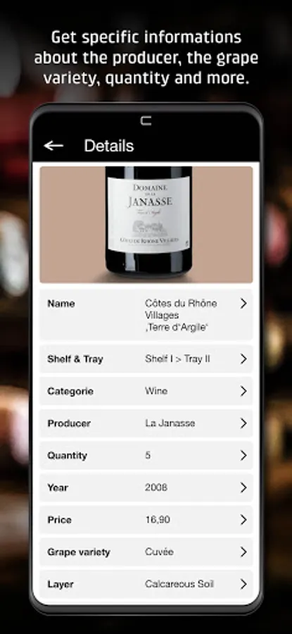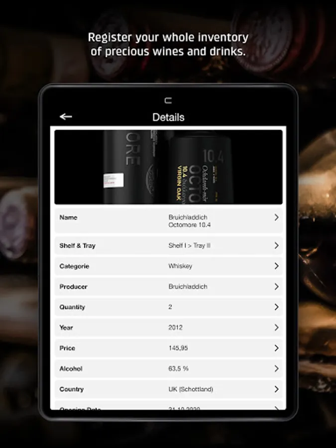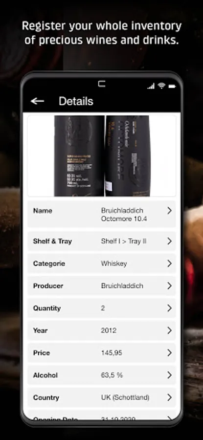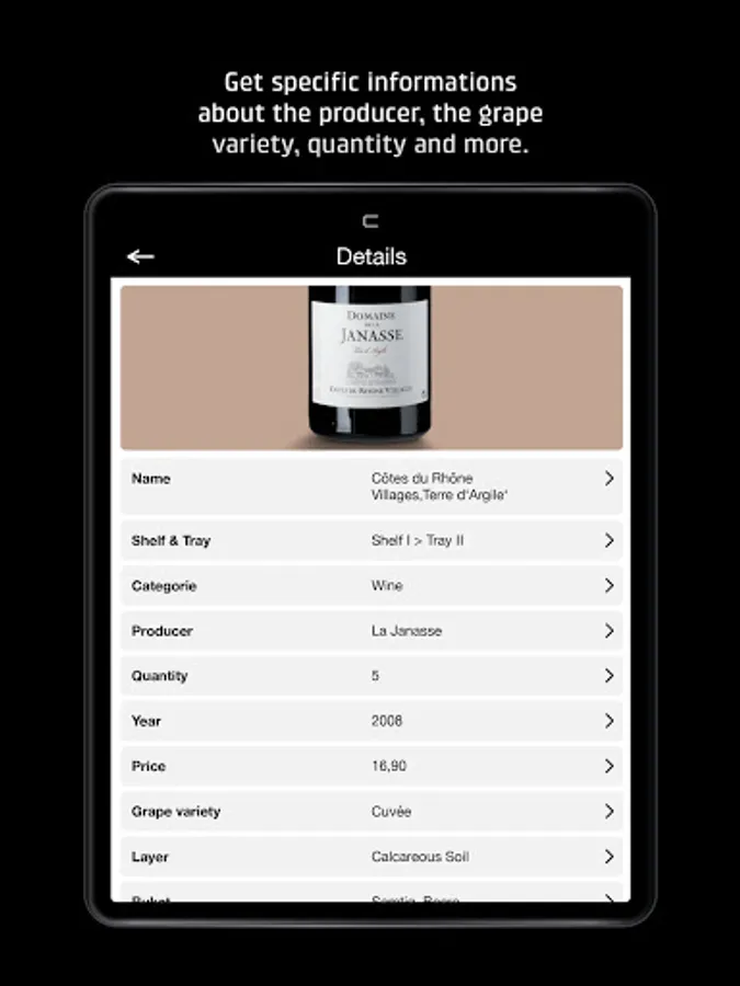 Design your digital archive according to various specifications such as type, price, vintage or quantity. Save your own photos, for example of the label, the winery or the bottle design. Create notes to ensure that you always have access to the important information about the wine or beverage.