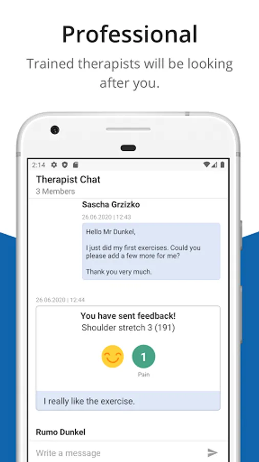 We value your feedback! If you have any questions regarding your training plan or your exercises, please message your therapist via the app. In case of technical support or suggestions for improvement, please contact our technology partner CASPAR Health.