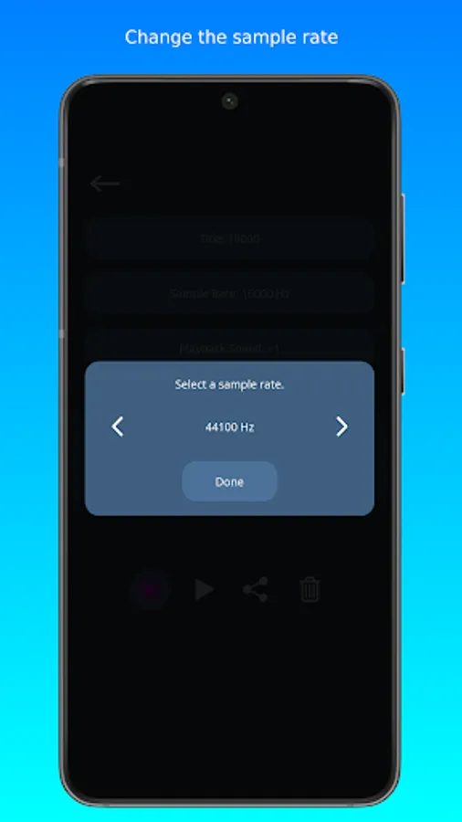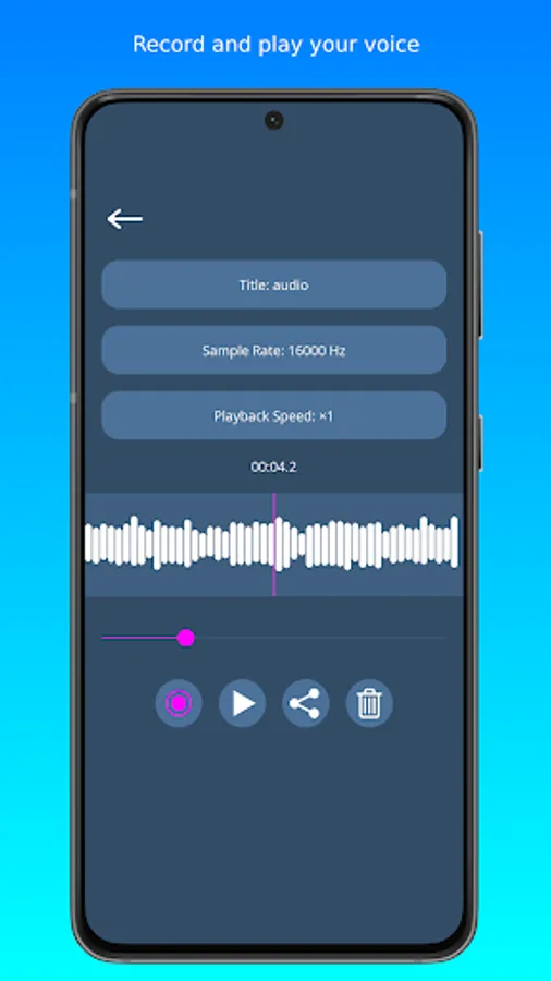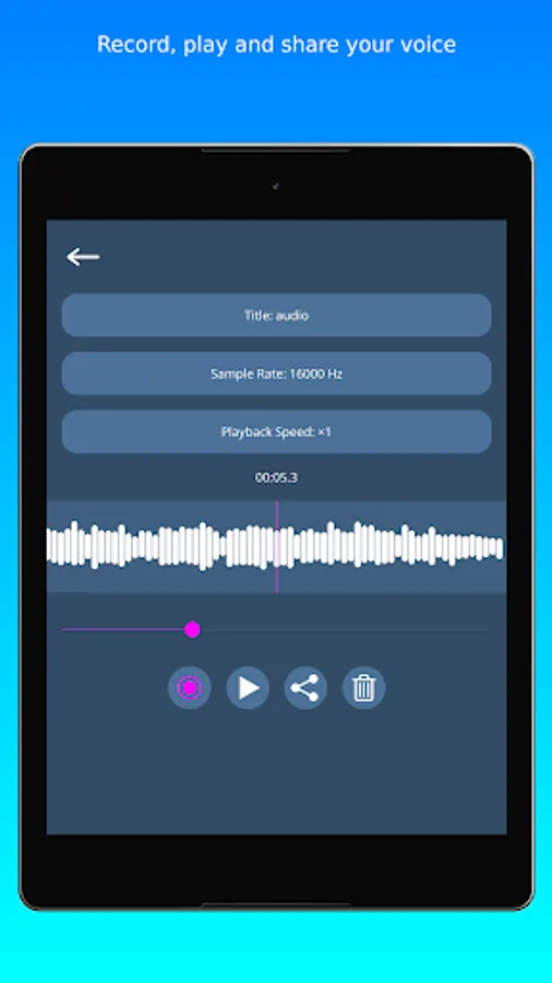 This app allows you to record and play your voice or any sounds you want. Before recording, you can choose a sample rate between 8 kHz and 48 kHz which allows you to control the audio quality. A higher sample rate will result in better quality but a higher file size at the end. Audio recordings are stored in wav format.