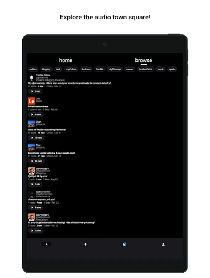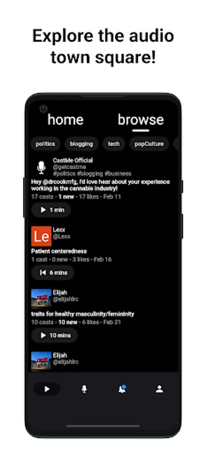 CastMe is an audio blogging platform where users listen to and share short audio clips (called "casts") with life updates, philosophy, politics, and more!