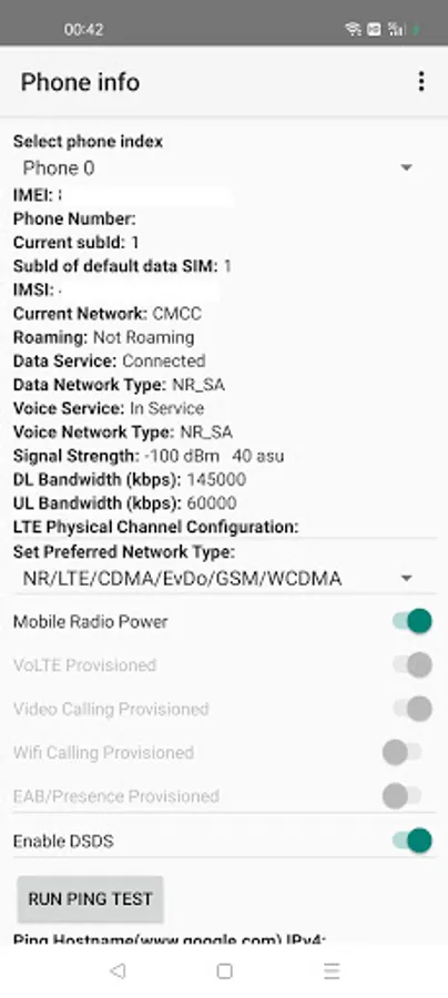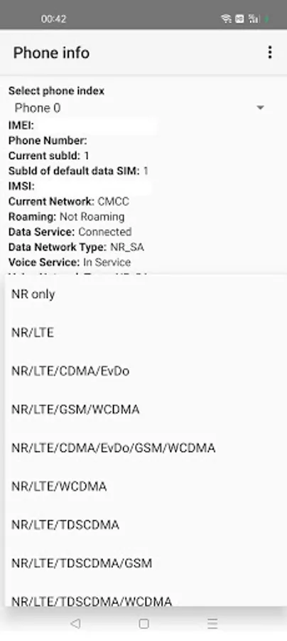 Tap "Phone Info" to enter a hidden setup page. At the bottom of this page, toggle "Set Preferred Network Type".