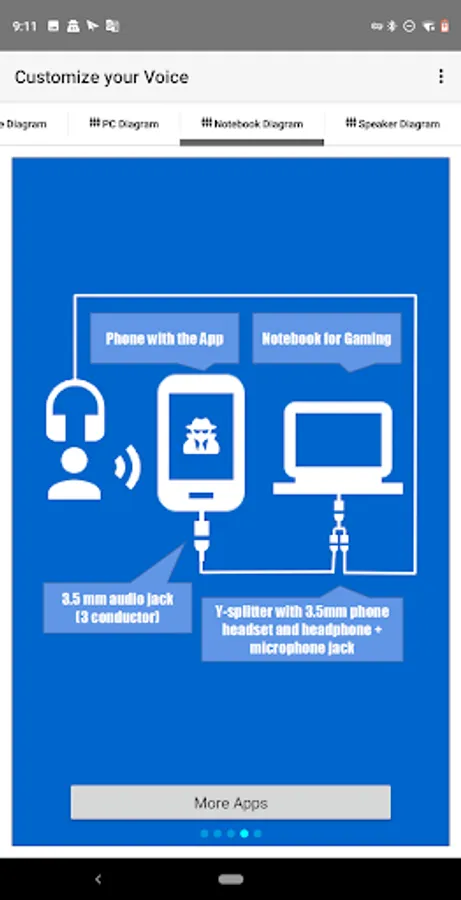 Use the mobile phone running Voice Changer for Call as a microphone, and connect the audio output to ①, ① to the female Microphone port of the PC, and connect the A headphone to the Headphone port of the PC. The PC can play games, voice chat and conference calls.