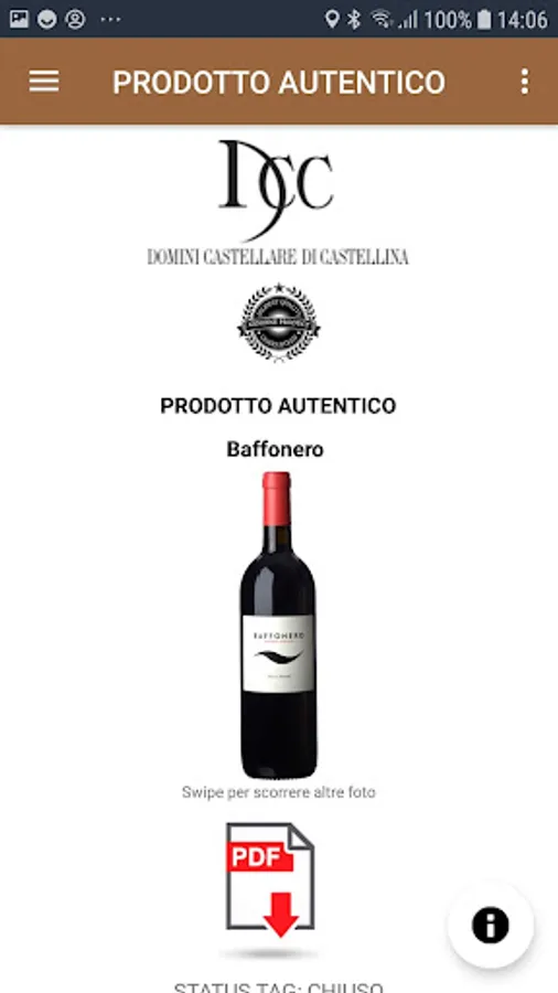 If the smartphone at the time of reading the TAG is in offline mode or does not have the connection available, only the authenticity data will be displayed, otherwise the complete wine card will be loaded.