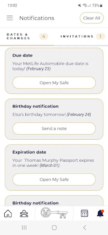 All of your important dates populate automatically on the in-app Calendar. Birthdays and anniversaries for your CastleKeyp Contacts, expiration and due dates for Keyp items, all in one place. Get custom in-app and push notifications to stay on top of it all.